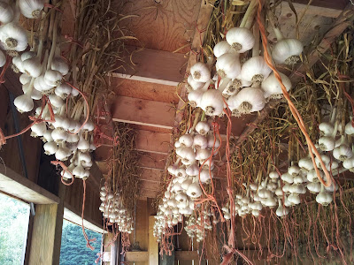 Have you ever seen 1700 bulbs of garlic in various stages of 'processing'? Doug had already informed us that it takes 20 passes through human hands to fully process garlic (now you know why most of it comes from China since it is so labour intensive!). So when I rounded the corner into the shed I saw how massive the operation was and how many uncleaned bulbs there were - well, that was when the disorder struck me.